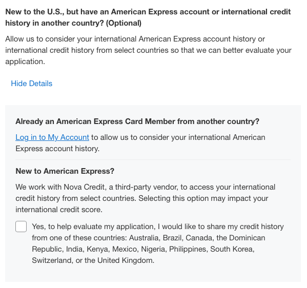 - If you are not an American Express-client in your home country, but if you are a citizen of the countries previously mentioned, you can allow third party vendor Nova Credit, to do a credit check on you to get you approved with a bit of a detour.